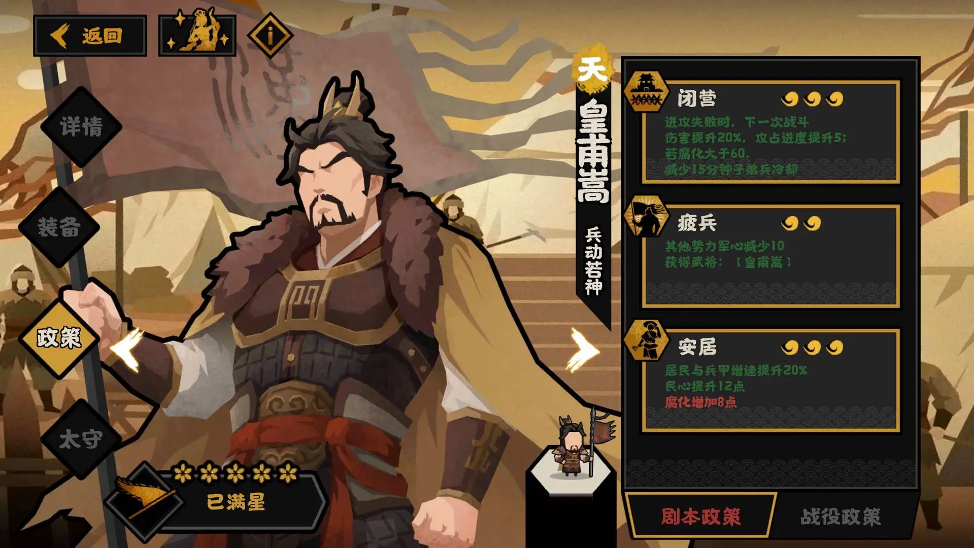 皇甫嵩的闭营政策在我方发起进攻但是战斗失败时才会生效,让下次战斗提升百分之20的伤害,同时额外增加五点攻占进度。当我方的...