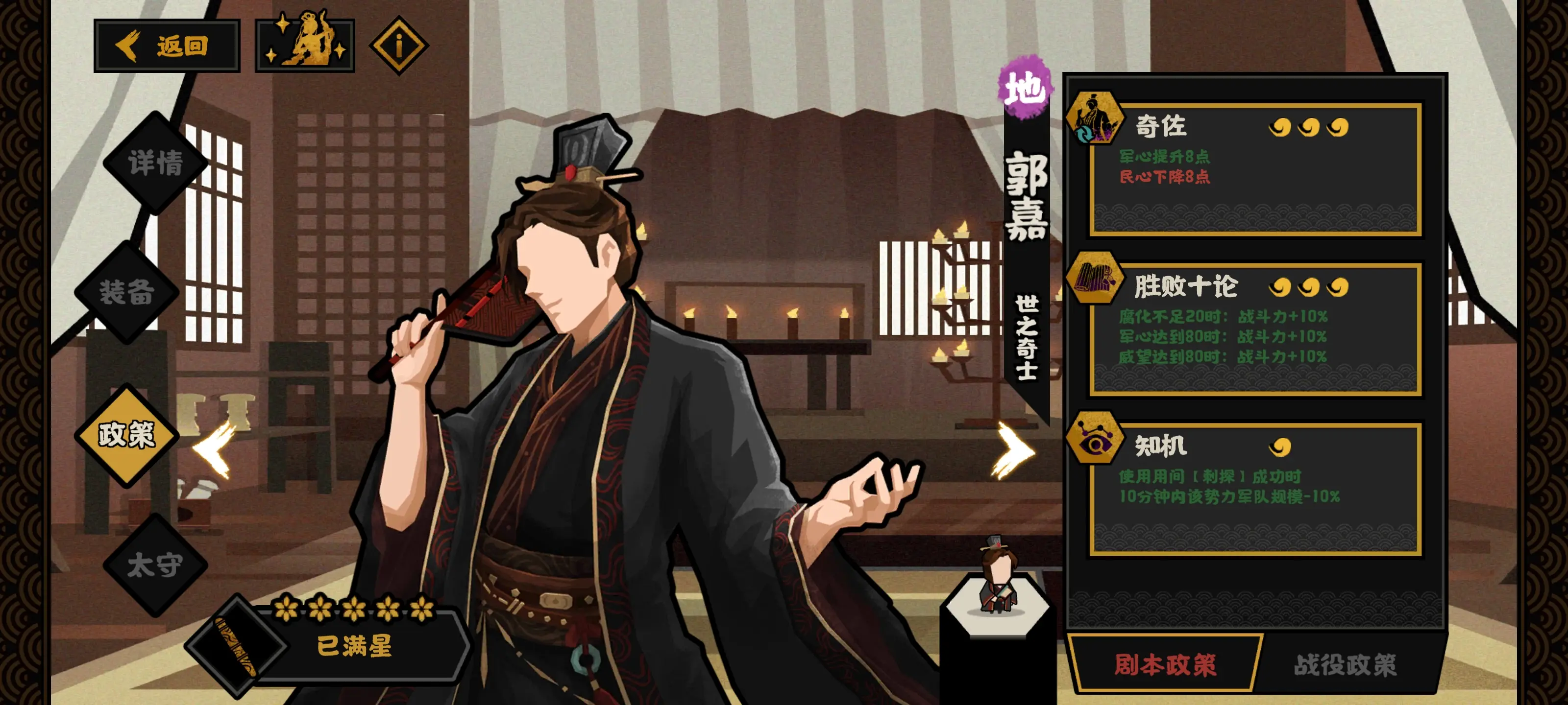 郭嘉的奇佐政策可以让玩家快速提升军心,因为它每隔四分钟就能循环一次,每次可以增加八点军心。和其他增加军心的政策相比,这个...