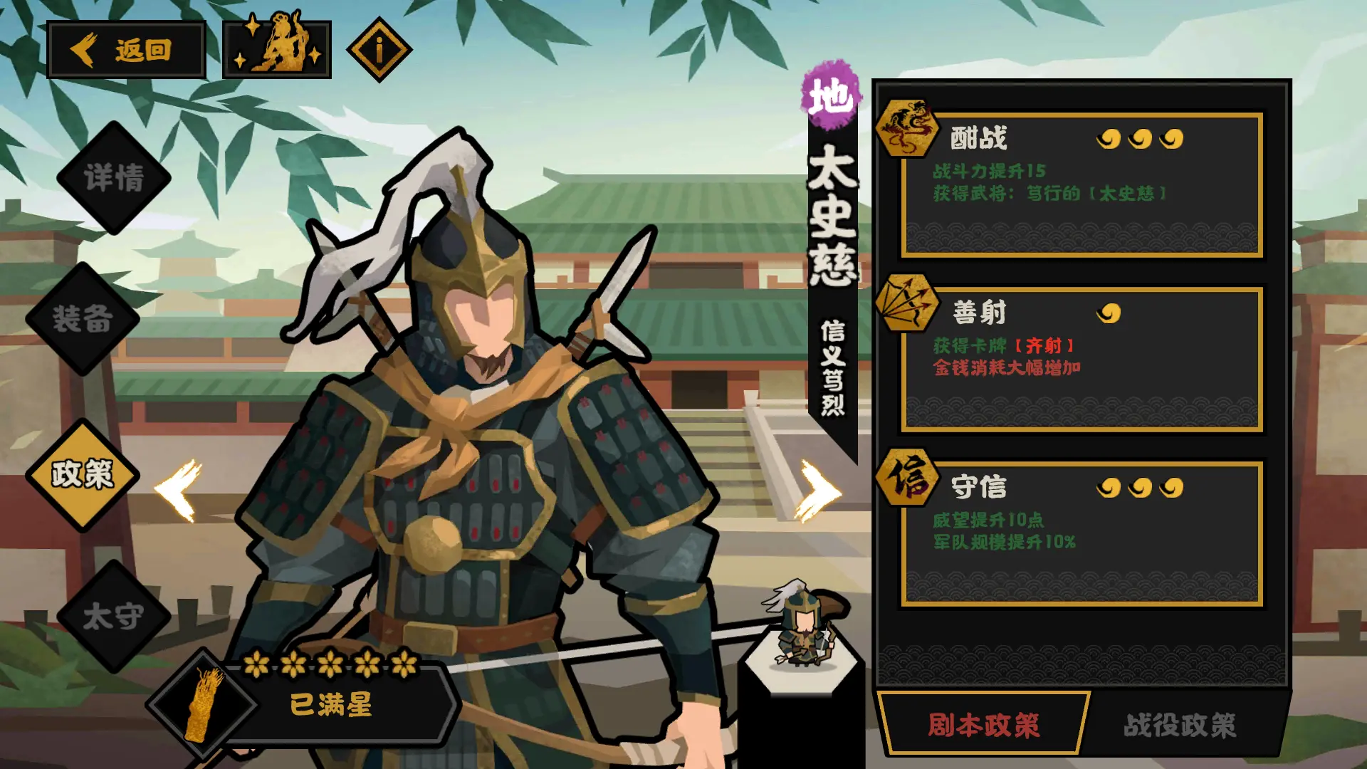 太史慈的酣战政策可以让我方的战力增加15点,同时获得武将太史慈,这里提供的太史慈自带笃行的正面性格。太史慈是一个弓兵武将...