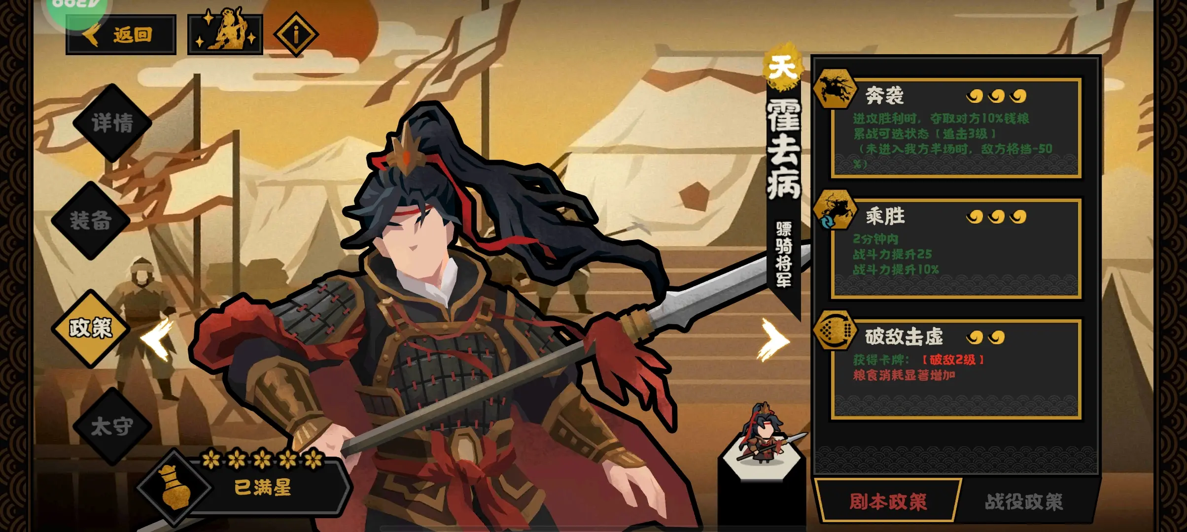 霍去病的突袭政策在我方发动进攻并且获胜时才会生效,能够从敌方势力里夺走百分之10的钱粮。在累战时可选的状态里会新增三级的...