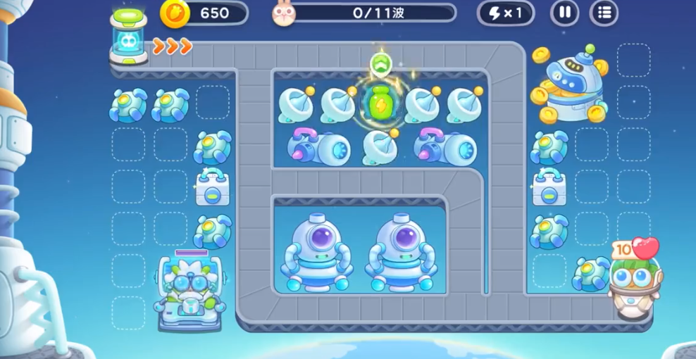 这一关主要靠地图里的兔迪生来通关,因为能够建造的只有毒针这一种炮塔,显然光靠它是无法应对后面的大波怪物。兔迪生头顶上有一...