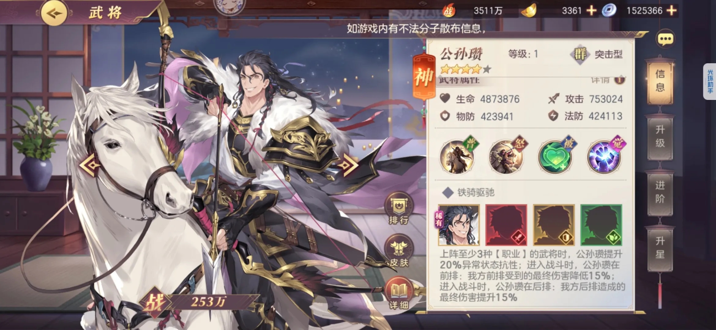 公孙瓒是首个拥有双重技能的神将,把他放在前后排时使用的技能具有不同的效果。当他站在前排时主要的效果是突击敌人,此时的他输...