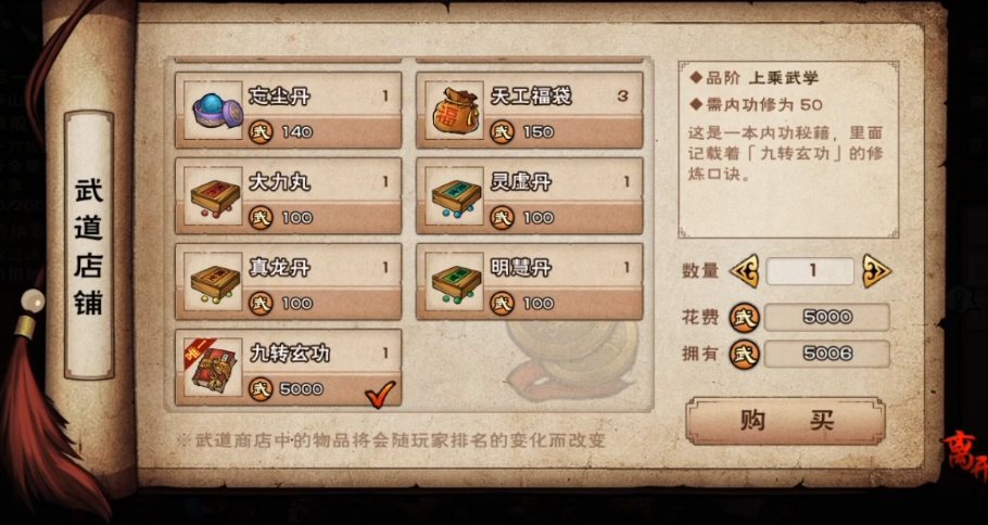 九转玄功是上乘内功里强度最高的,但是玩家很难在前中期获得,到了后期又该换成品质更高的镇派内功了。它只能在武道商店里换,需...