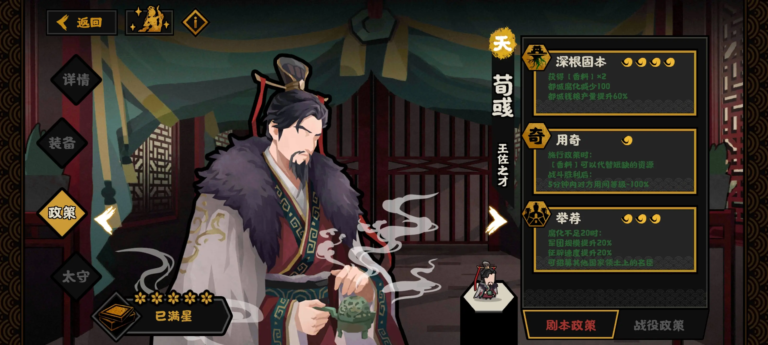 荀彧的政策里最基础的是深根固本,因为剩下两个政策的效果都需要由这个政策来触发。使用深根固本后可以获得两个香料,同时让都城...