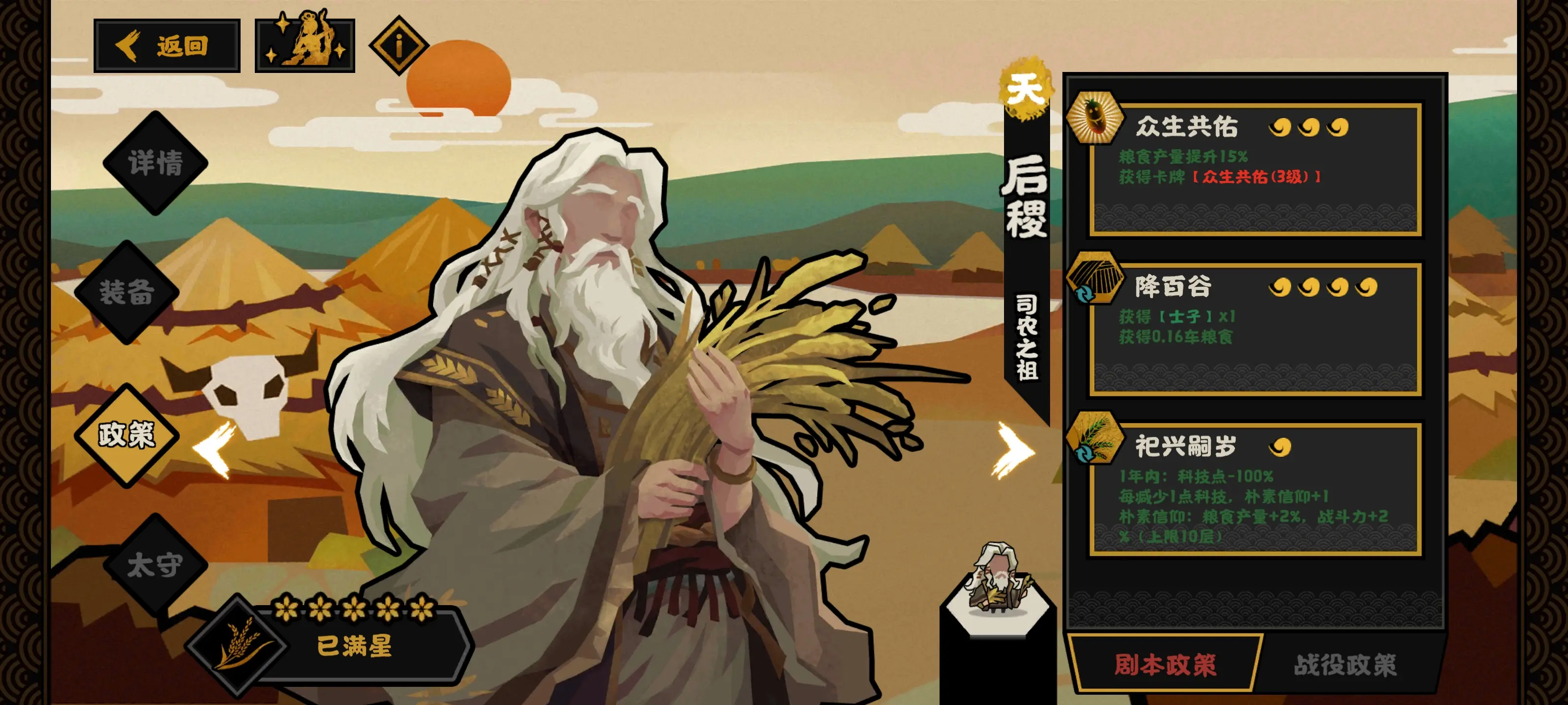 后稷作为一个偏民生属性的名臣,他的三个政策效果比较全面但是每种效果的数值都只是中等水平,没有特别突出的。因此他的强度也是...