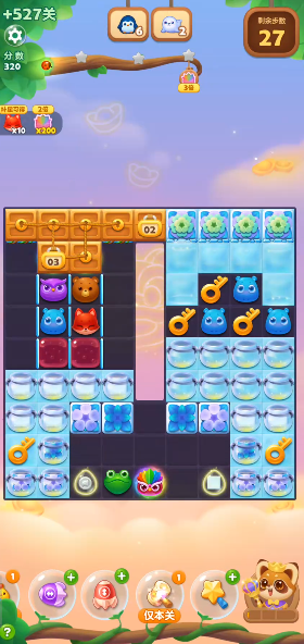 本关的过关要求是收集六个企鹅和两个海豹,它们隐藏在厚厚的雪块下面,只有把上方覆盖的雪块和冰块都消除掉才能收集。开局需要先...